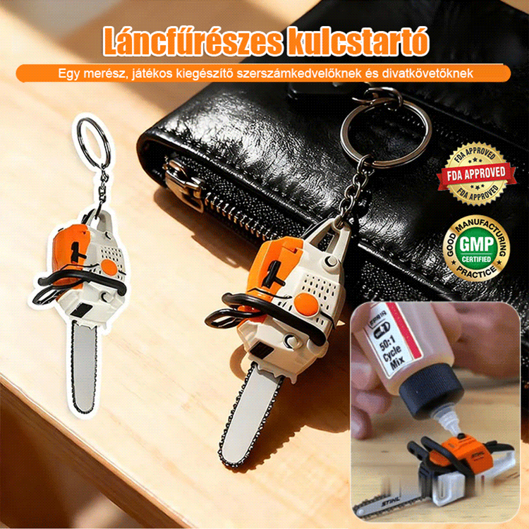 Rajzfilm hordozható láncfűrész kulcstartó függő